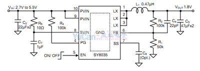SY8035 is a high-efficiency 1 Mhz synchronous ste down DC-DC regulator IC capable of delivering up to 5A output current. SY8035 operates over a wide input voltage range from 2.7V to 5.5V and integrates the main switch and the synchronous switch with very low RDS(oN) to minimize the conduction losses